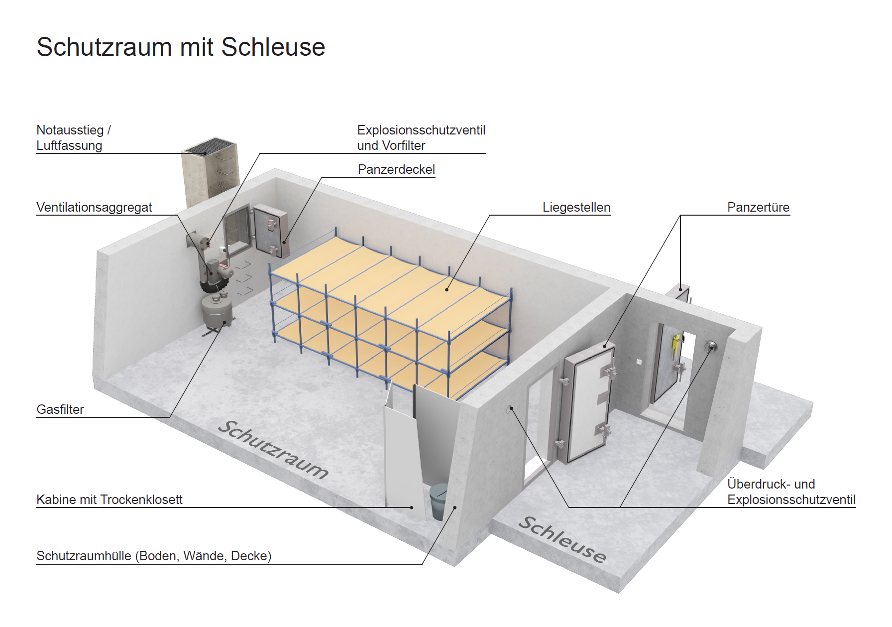 - Um die Zufuhr frischer Luft zu gewährleisten, ist der Schutzraum mit einem Belüftungssystem ausgestattet. Dieses umfasst die Luftfassung, das Explosionsschutzventil und den Vorfilter, das Ventilationsaggregat (Belüftungsgerät) und den Gasfilter sowie das Überdruck- und Explosionsschutzventil.