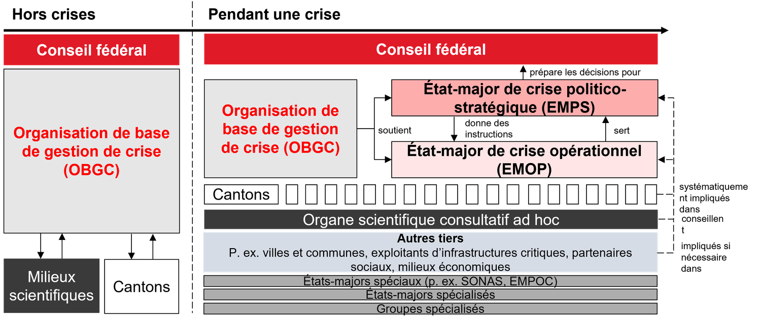 L’organisation de crise interdépartementale de l’administration fédérale se compose d’une organisation de base de gestion de crise (OBGC) permanente et de deux états-majors activés en cas de besoin : l’état-major de crise politico-stratégique (EMPS) et l’état-major de crise opérationnel (EMOP). Ces derniers peuvent être mis en place parallèlement, mais pas nécessairement dans tous les cas.