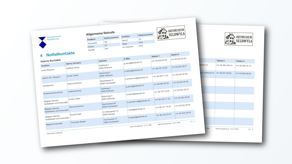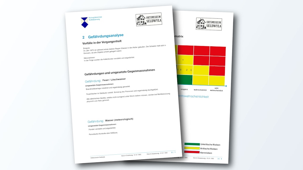 Un piano d’emergenza – sia per i beni culturali mobili conservati presso istituzioni della memoria come musei, archivi e biblioteche, sia per quelli immobili – è fondamentale per essere preparati ad affrontare eventi imprevisti. Un piano ben strutturato consente di ridurre le incertezze, agevola il processo decisionale e assicura che tutte le parti coinvolte sappiano esattamente quali misure adottare in caso d’emergenza. In questo modo è possibile ridurre al minimo i rischi, limitare i danni e garantire la protezione dei beni culturali.