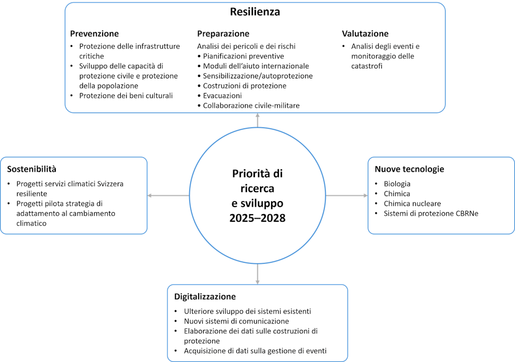 Il primo punto chiave, la «resilienza», viene affrontato in modo globale. Esso comprende progetti che riguardano i settori della prevenzione, della preparazione e della valutazione di catastrofi e situazioni d’emergenza e tengono conto delle sfide individuate nell’analisi dei trend, tra cui i cambiamenti climatici, il cambiamento demografico e la polarizzazione geopolitica. Concretamente il piano include anche progetti di ricerca sull’analisi nazionale dei rischi «Catastrofi e situazioni d’emergenza in Svizzera» (CES), sulla protezione delle infrastrutture critiche, sulla conservazione a lungo termine dei beni culturali digitali (Standard minimo TCI) e sullo sviluppo di strutture di protezione per la popolazione in caso di conflitto armato.